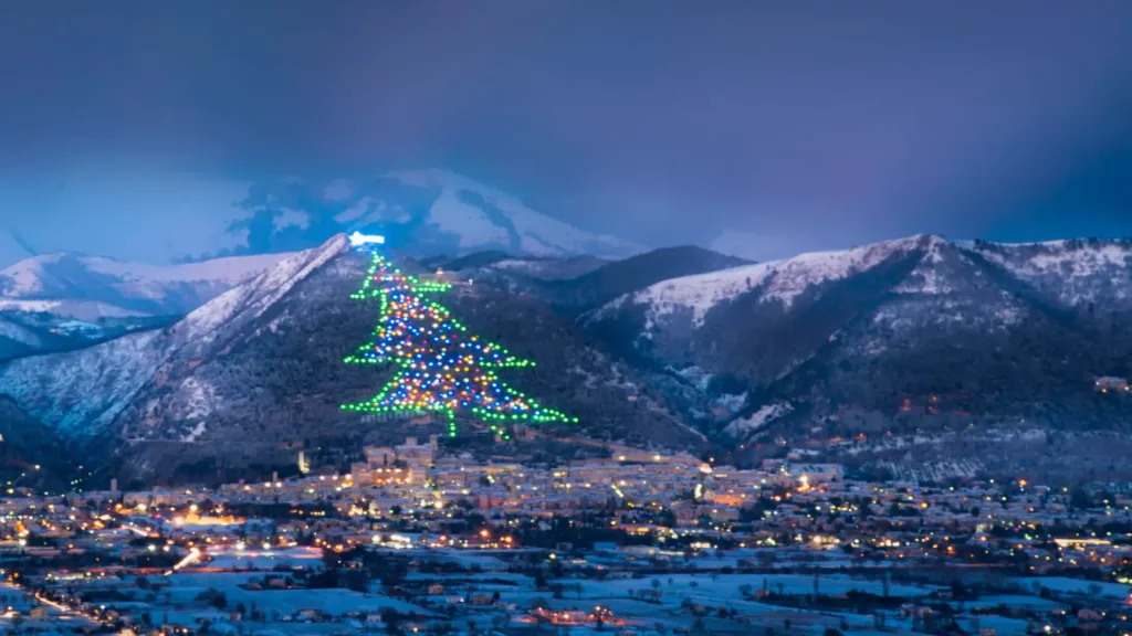 Ilumina el Monte Ingino con más de 900 luces y 300 lámparas LED, visible a kilómetros, con animaciones dedicadas a Dante Alighieri.