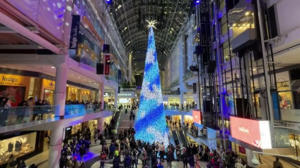 Árbol suspendido dentro de las galerías, inspirado en cuentos europeos del siglo XIX, con espectáculos de luz cada 30 minutos.