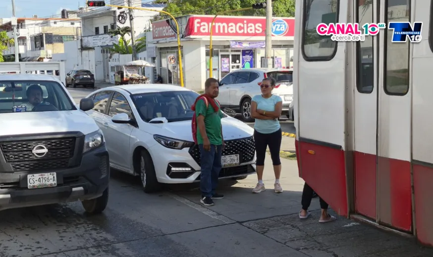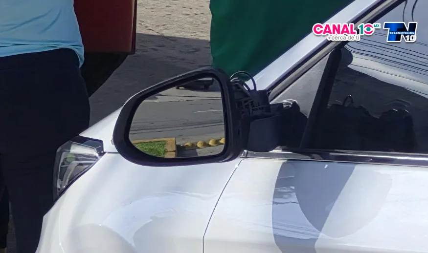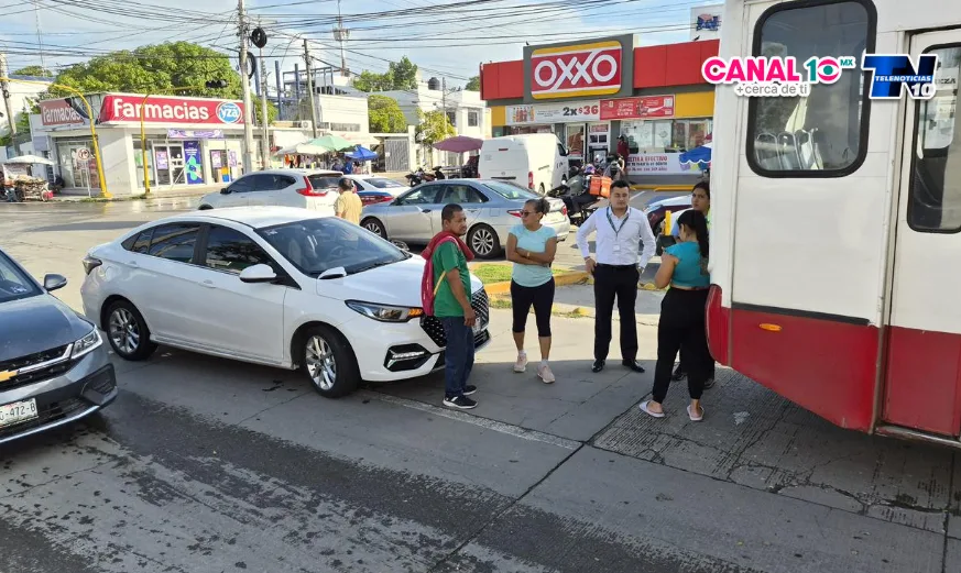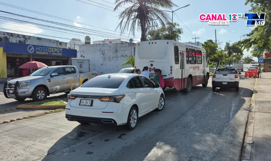 En ese momento, la conductora de un automóvil Omoda, color blanco y con matrícula DHG-086-B, intentó incorporarse al carril del urbano. Debido a la maniobra, el vehículo particular golpeó de costado la pesada unidad, ocasionando daños visibles, entre ellos la afectación del espejo lateral izquierdo de su vehículo.