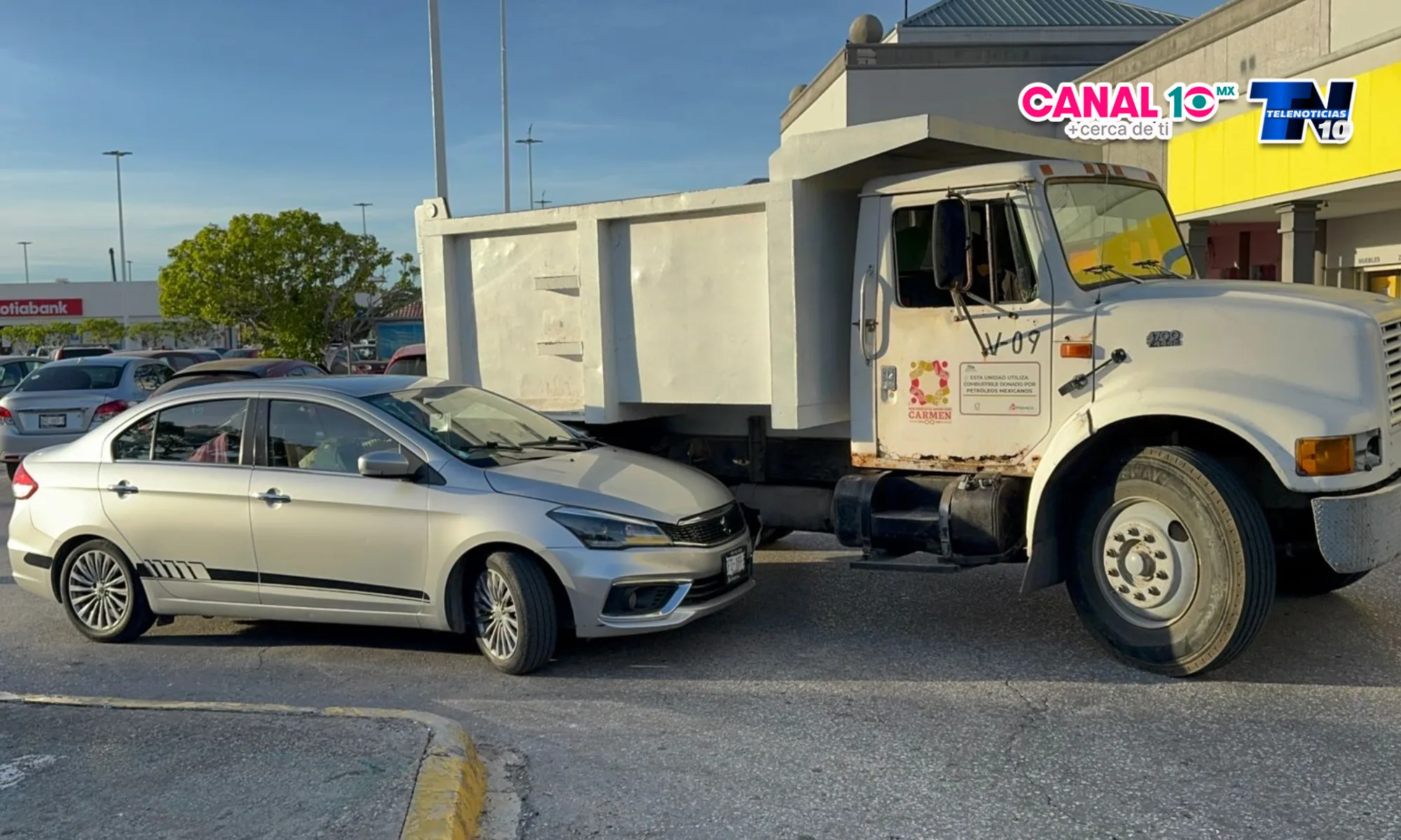 Ciudad del Carmen, Campeche.- Un percance vehicular se registró la tarde de este jueves en el estacionamiento de la tienda Soriana Aviación. Un automóvil particular se impactó contra un camión de Servicios Públicos Municipales, generando importantes daños materiales y congestionamiento en la zona interna del recinto comercial.
