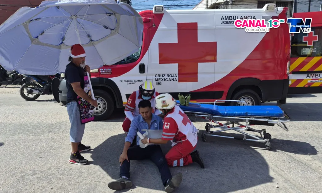 Ciudad del Carmen, Campeche.- Un joven motociclista fue trasladado a un hospital con una posible luxación en el brazo izquierdo, luego de verse involucrado en un accidente vial con una carro moto vendedora de agua, en calles de la colonia Belisario Domínguez.