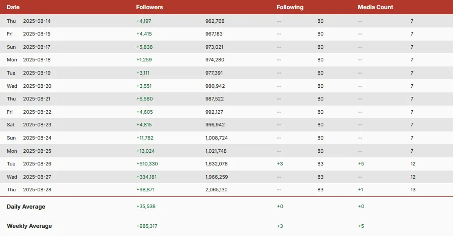 - Instagram: de 1.02M a 2.07M seguidores (+1 millón en 48 hrs)
