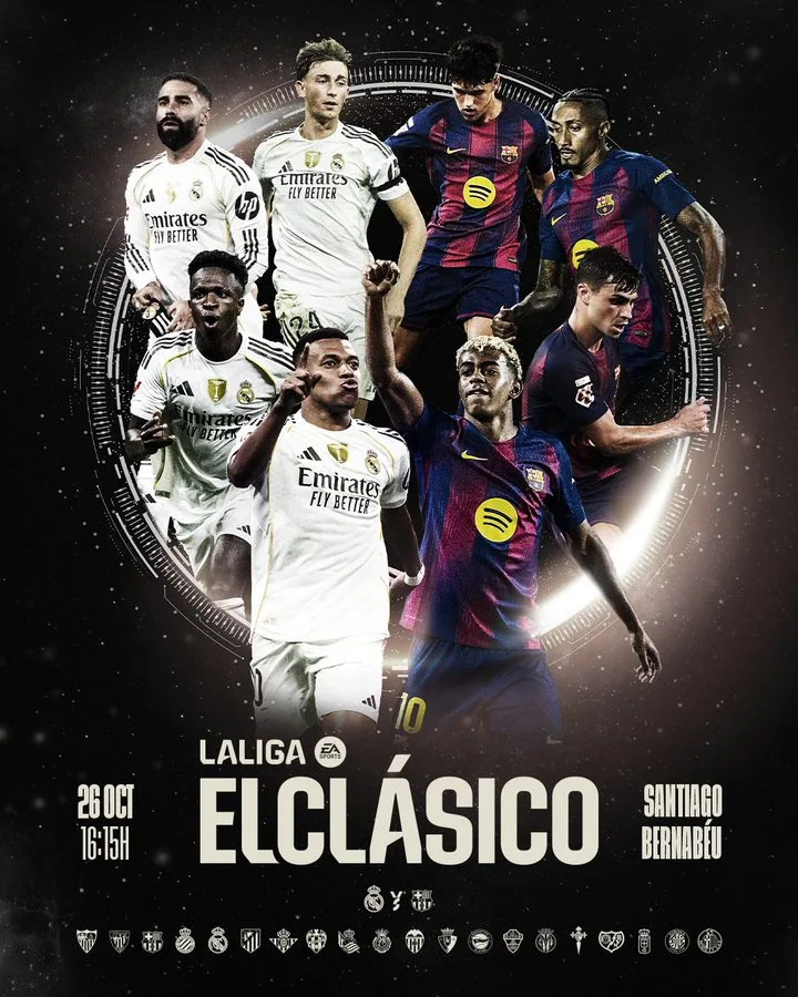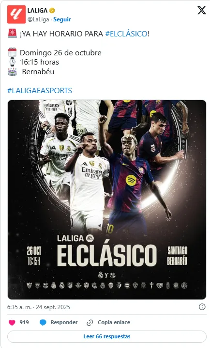 España.- El primer Clásico español de la temporada 2025-2026 entre Real Madrid y Barcelona ya tiene fecha y hora confirmadas. LaLiga anunció a través de sus redes sociales que el esperado duelo se disputará el domingo 26 de octubre a las 16:15 horas (hora local) en el Estadio Santiago Bernabéu.