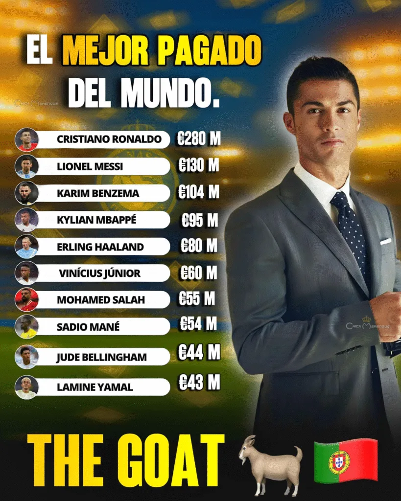 En el podio de los mejor pagados también se encuentra el francés Karim Benzema (Al-Ittihad) en tercer lugar, con 89 millones de euros.