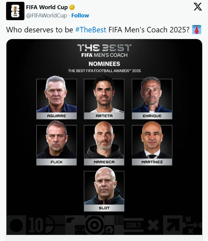El ‘Vasco’ comparte nominación con Luis Enrique, Mikel Arteta, Hansi Flick, Enzo Maresca, Roberto De Zerbi y Arne Slot, estrategas que han tenido un 2025 destacado en distintas ligas y selecciones del mundo.