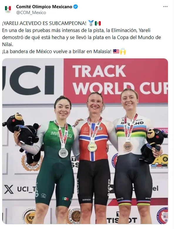 México.- La delegación mexicana volvió a destacar en la tercera parada de la Copa del Mundo de Ciclismo de Pista, celebrada en Nilai, donde logró subir al podio con una medalla de plata y otra de bronce en distintas pruebas.