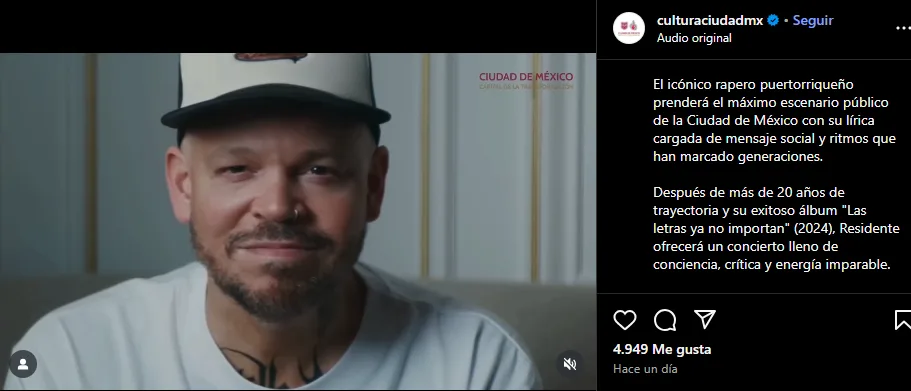 Ciudad de México. – El cantante puertorriqueño Residente ofrecerá un concierto gratuito en el Zócalo capitalino el próximo sábado 6 de septiembre a las 20:00 horas, anunció la Secretaría de Cultura de la CDMX.