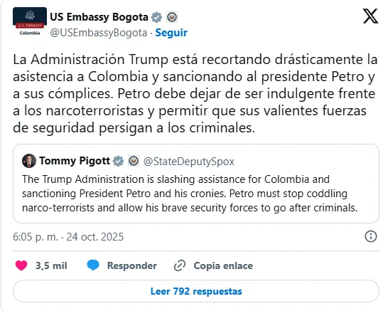 Las relaciones entre Bogotá y Washington han atravesado una fuerte tensión desde septiembre, cuando Colombia fue retirada de la lista de países que cooperan en la lucha contra el narcotráfico. Estados Unidos ha cuestionado las posturas del mandatario colombiano, y Trump lo acusó recientemente de ser “líder del narcotráfico”.