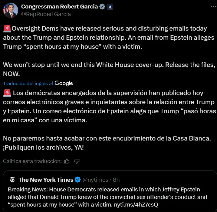El representante Robert García, el demócrata de mayor rango en el comité, aseguró que estos correos “plantean serias dudas” sobre qué más oculta la Casa Blanca. “Cuanto más intenta Trump encubrir los archivos de Epstein, más descubrimos”, afirmó.