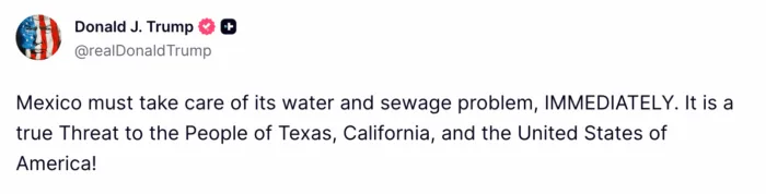 El mandatario escribió este mensaje tras amenazar el pasado lunes con imponer un arancel del 5 por ciento a México por el supuesto incumplimiento del Tratado de Aguas de 1944, que regula la gestión de los ríos Colorado, Bravo y Conchos, que cruzan ambas naciones.