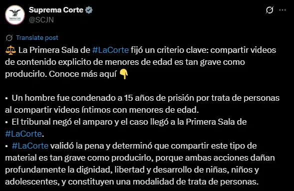 En un mensaje publicado en la red X (antes Twitter), la SCJN subrayó que difundir videos sexuales de menores “merece el mismo castigo que producirlos”, ya que ambas conductas causan el mismo daño y deben sancionarse de igual manera.