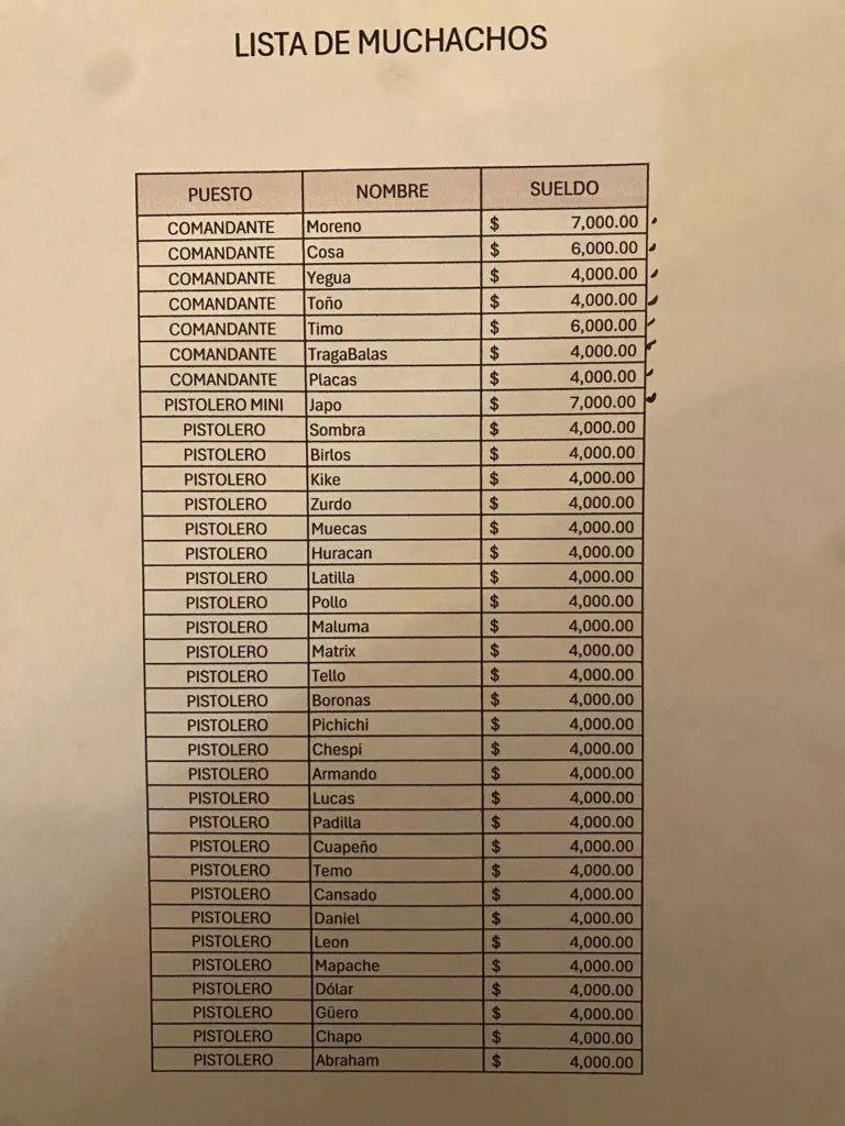 Según los registros financieros del CJNG, elaborados manualmente y en computadora, se documentaron pagos semanales por funciones específicas dentro de la organización: