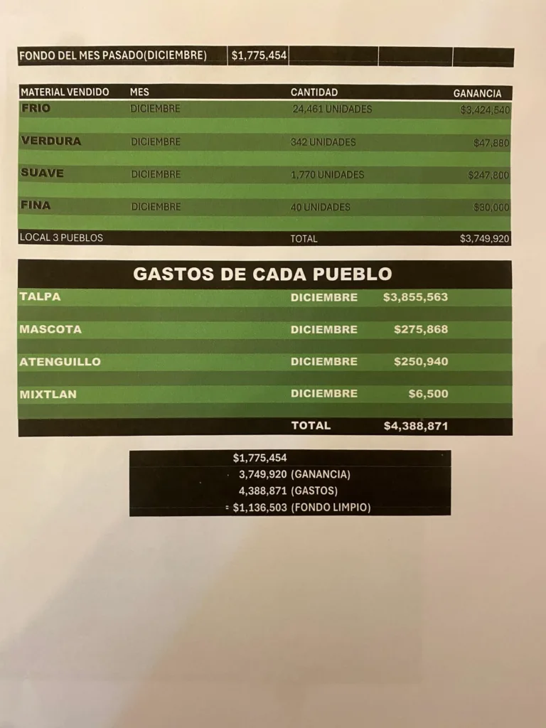 Los documentos muestran que, tan solo en diciembre de 2025, el CJNG obtuvo ingresos por más de 8.7 millones de pesos en Tapalpa y zonas cercanas por la venta de drogas y otros negocios ilícitos. Asimismo, los gastos operativos para sostener la estructura criminal en el área ascendieron a más de 1.3 millones de pesos ese mismo mes, según registros.