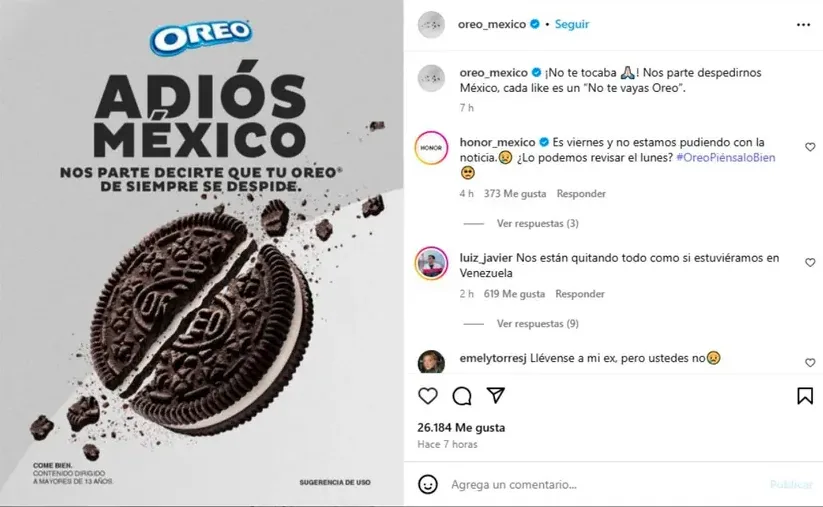 En las redes de Oreo México: apareció una imagen que impactó a todos, pues llevaba el texto “Adiós México. Nos parte decirte que tu Oreo se despide para siempre”, acompañada de la foto de una galleta partida por la mitad.