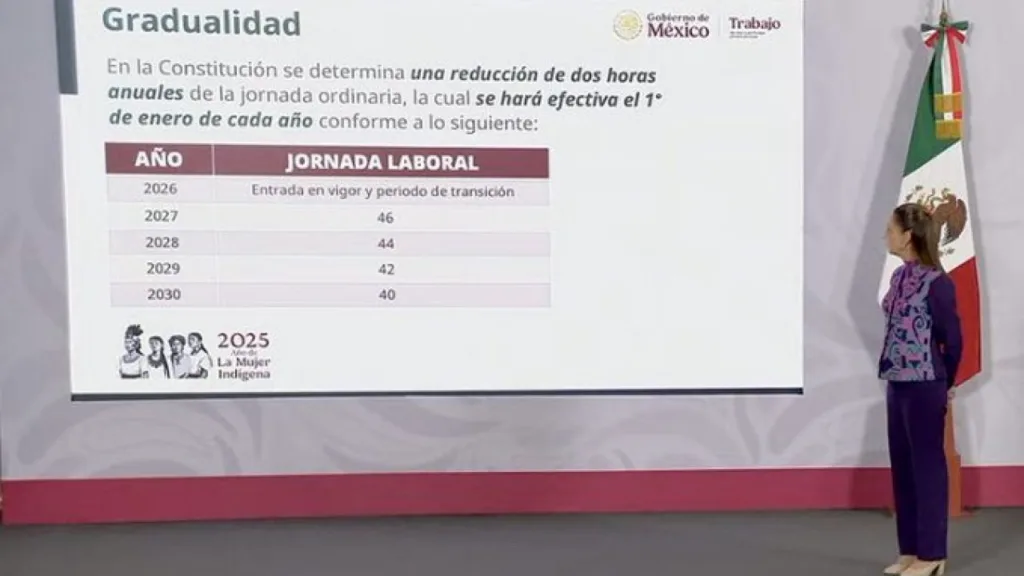 “Esta reducción no puede ser de un momento a otro, además, atendiendo con ello, la recomendación de convenio 116 de la OIT, en donde se puedan hacer de manera paulatina estos cambios, integrándolos de manera también progresiva. Esto nos da oportunidad de qué avancemos año con año en una reducción de dos horas a partir del año 2027, para alcanzar las 40 horas en el enero del año 2030”, anunció.
