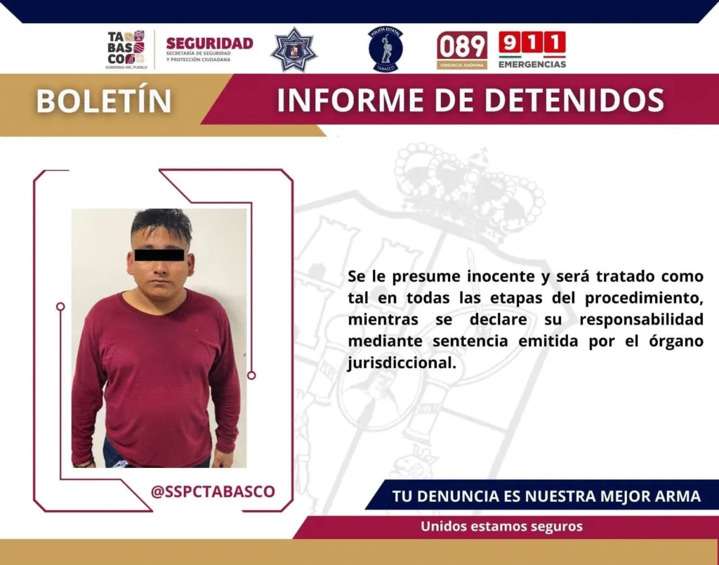 Tabasco.- Durante patrullajes preventivos de la Secretaría de Seguridad y Protección Ciudadana (SSPC) en coordinación con la Fuerza Interinstitucional de Reacción Táctica (FIRT) Olmeca, detuvieron a un masculino por delitos contra la salud.