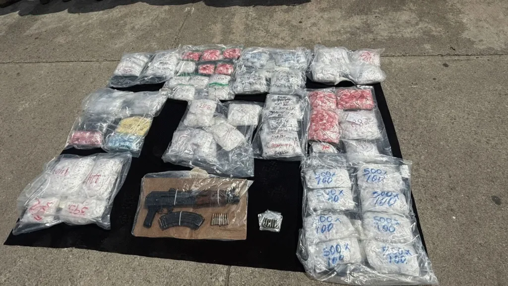 Las autoridades repelieron agresión y lograron amagar a los individuos, les decomisaron más 30,000 mil dosis de estupefaciente conocido como cristal, los detenidos eran de César Guadalupe “N” alias “el gordo” de 21 años y Reyna de los Ángeles “N” alias “la gorda o la contadora”, de 26 años, además les aseguran un arma larga tipo fusil CART AK-47, calibre 762×39 mm, con un cargador metálico y 8 cartuchos útiles, también se les aseguró un vehículo marca Nissan Versa, color azul, sin placas, el cual tenía impacto de bala, de acuerdo con el decomiso se evaluó a una cantidad de más de 1 millón de pesos en productos narcóticos, ambos fueron puestos a disposición de las autoridades de la Vicefiscalía de alto impacto para iniciar con su investigaciones correspondientes.