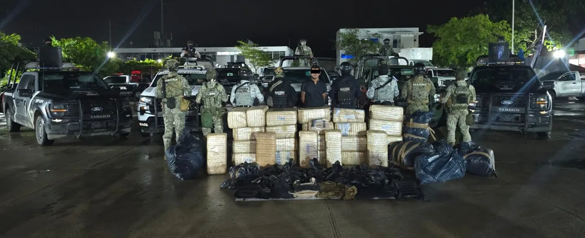 La Fuerza Interinstitucional de Reacción Táctica (FIRT) Olmeca aseguró la madrugada de este martes una camioneta con un cargamento de 608.3 kilogramos de marihuana, siendo detenido también un masculino como presunto responsable, el cual venía armado.