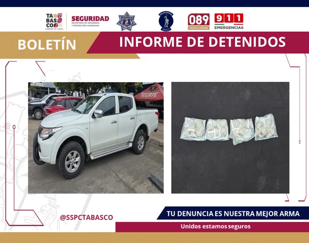 Tabasco.- Como parte de la Estrategia Antiextorsión y del Plan de Contención del Delito desplegado por la Secretaría de Seguridad y Protección Ciudadana de Tabasco y la Fuerza Interinstitucional de Reacción Táctica (FIRT) Olmeca, fueron detenidas 4 personas como presuntas responsables de delitos contra la Ley General de Salud y Robo de Vehículo.