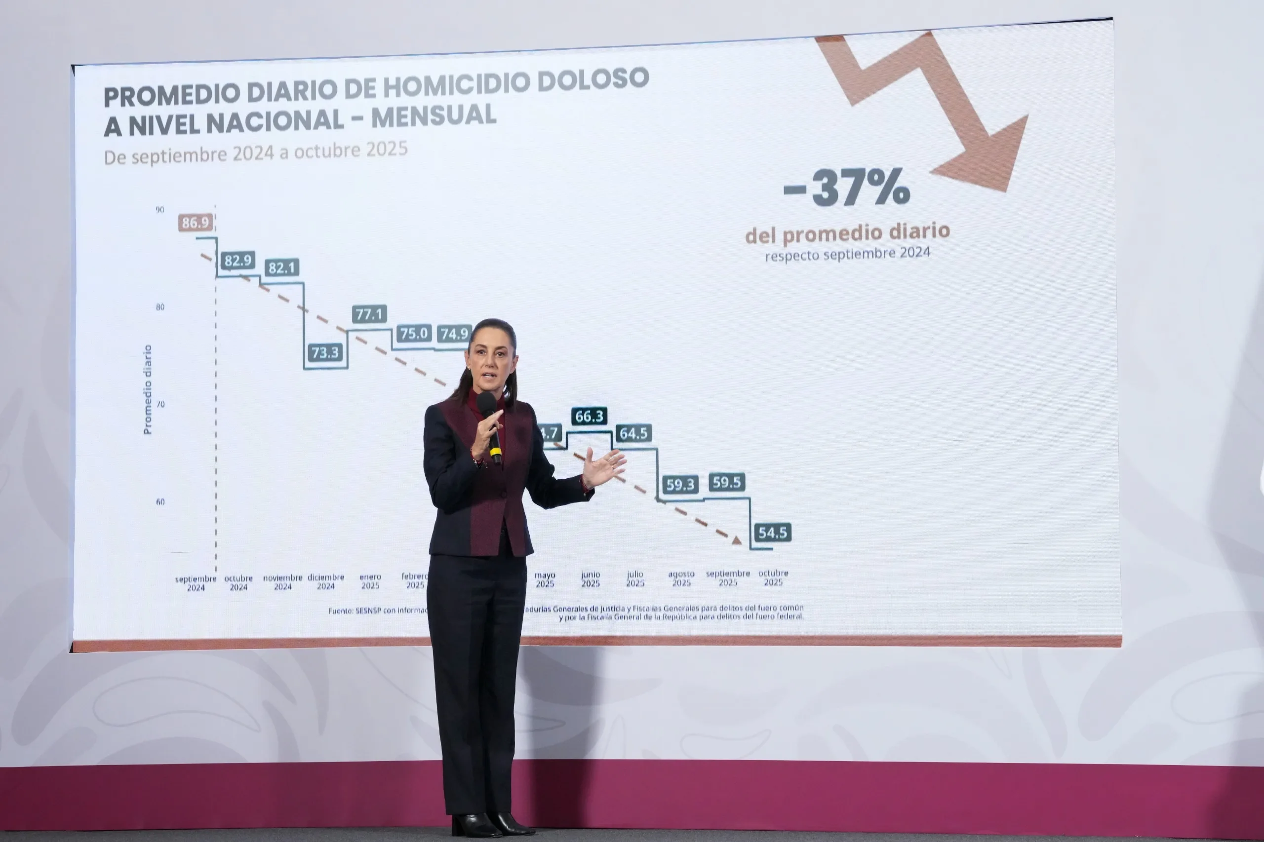 De igual forma, el reporte presentado precisa que, en los últimos 13 meses, la administración de la Presidenta Claudia Sheinbaum ha presentado una tendencia sostenida a la baja, al iniciar con un promedio diario de 86.9 homicidios en el país, y cerrar en octubre de 2025 con 54.5.