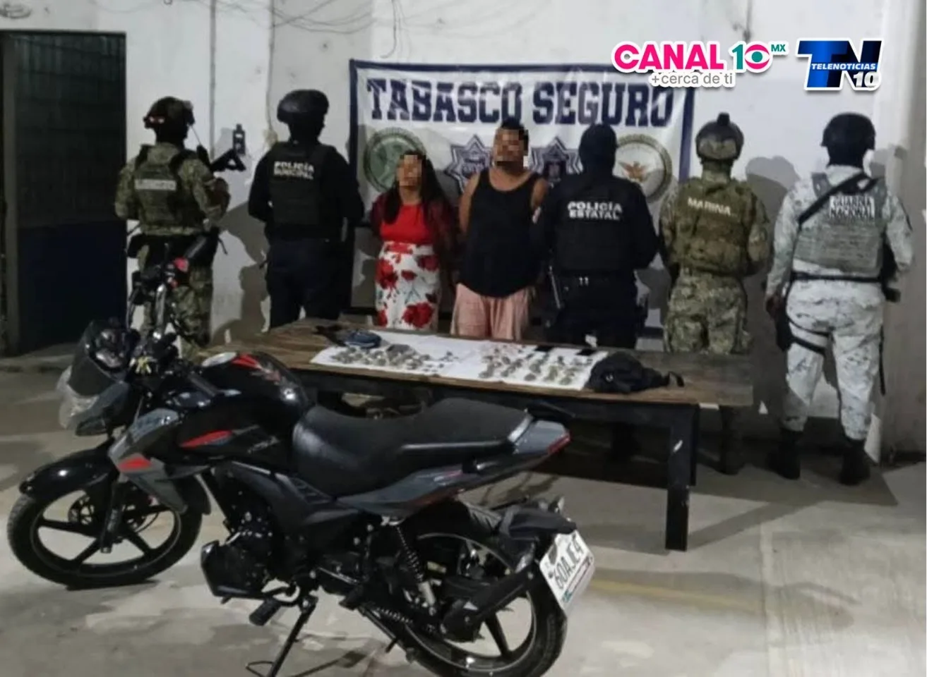 Los detenidos dijeron llamarse Luis Roberto “N”, alias El Toño, de 38 años de edad, con domicilio en el municipio de Cunduacán, y Deisy “N”, de 26 años de edad, además de la posible droga, a los detenidos se les decomisaron tres teléfonos celulares de diferentes marcas, dos mariconeras, 250 pesos en efectivo, así como una motocicleta Italika 125Z color negro con rojo, con placas de circulación 60AJE8 y con número de serie 3SCK58LA9S1026506.