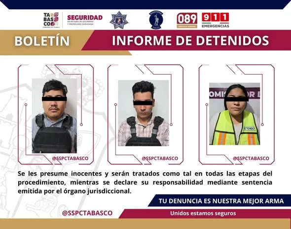 Detuvieron a Pablo “N”, alias “El Gatito”, de 30 años; Luis Manuel “N”, alias “El Flaco”, de 33; y Cintia “N”, de 21. Fueron asegurados sobre la carretera a Medellín y Madero 4ta sección, en la ranchería Jolochero 2da sección de Centro, Tabasco.