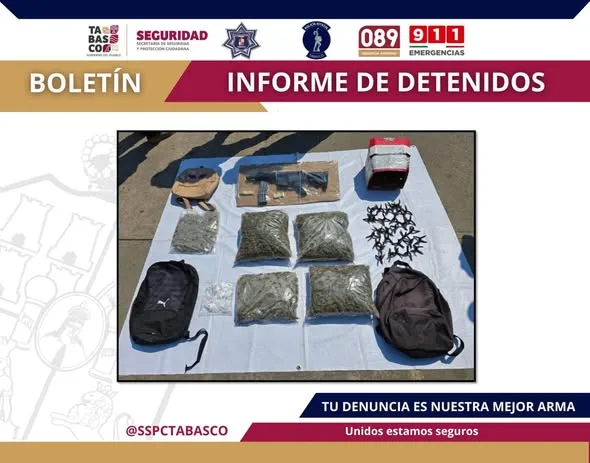 El Grupo Especial Tabscoob y la FIRT Olmeca detuvieron en Centro, Tabasco, a dos hombres y una mujer presuntamente vinculados con delitos contra la salud y portación de arma de fuego; les aseguraron droga con características de cristal y marihuana, un arma larga con cargador abastecido y un vehículo con reporte de robo en Jalisco.