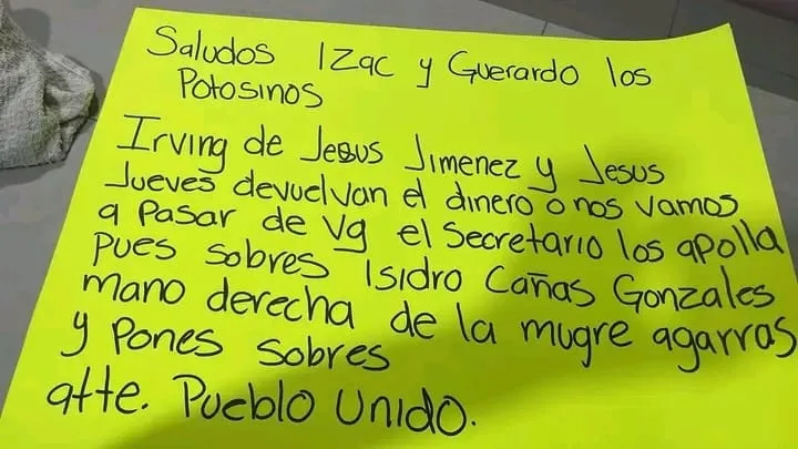 “Saludos Izac y Gerardo los Potosino, Irving de Jesús Jiménez y Jesús, jueves devuelvan el dinero o nos vamos a pasar de vg, el secretario los apolla pues sobre, Isidro Cañas González mano derecha de la mugre agarras y pones sobres, atte El Pueblo”.