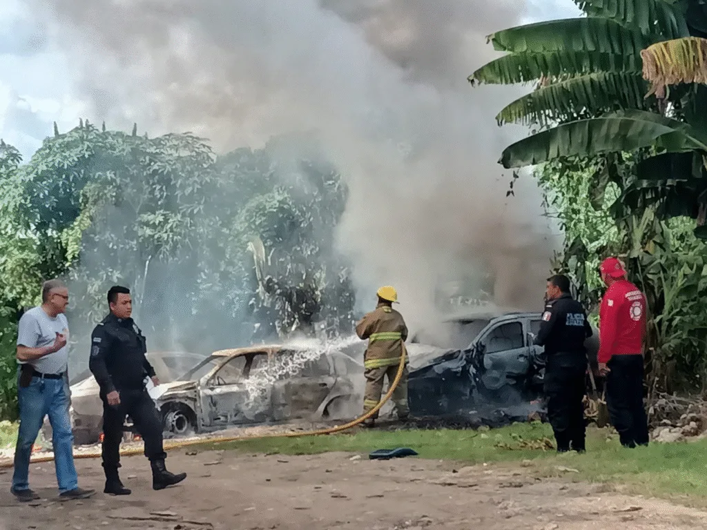 En Atasta un indigente quema pastizal y tres vehículos de un taller agarran fuego