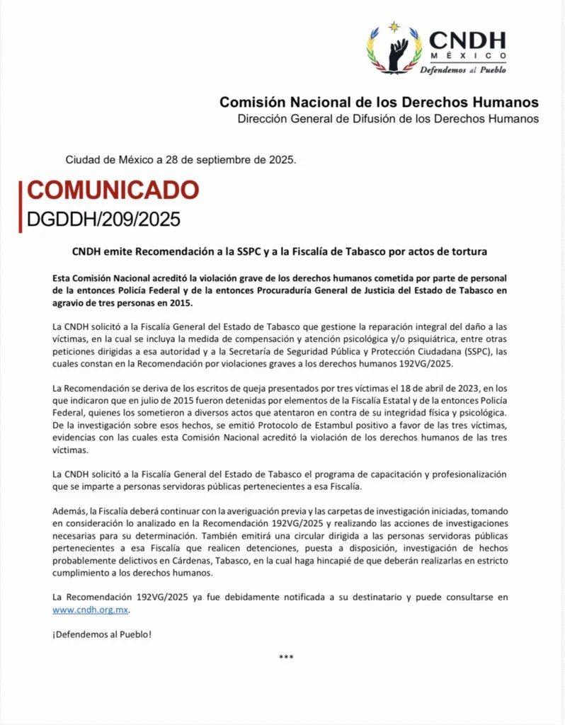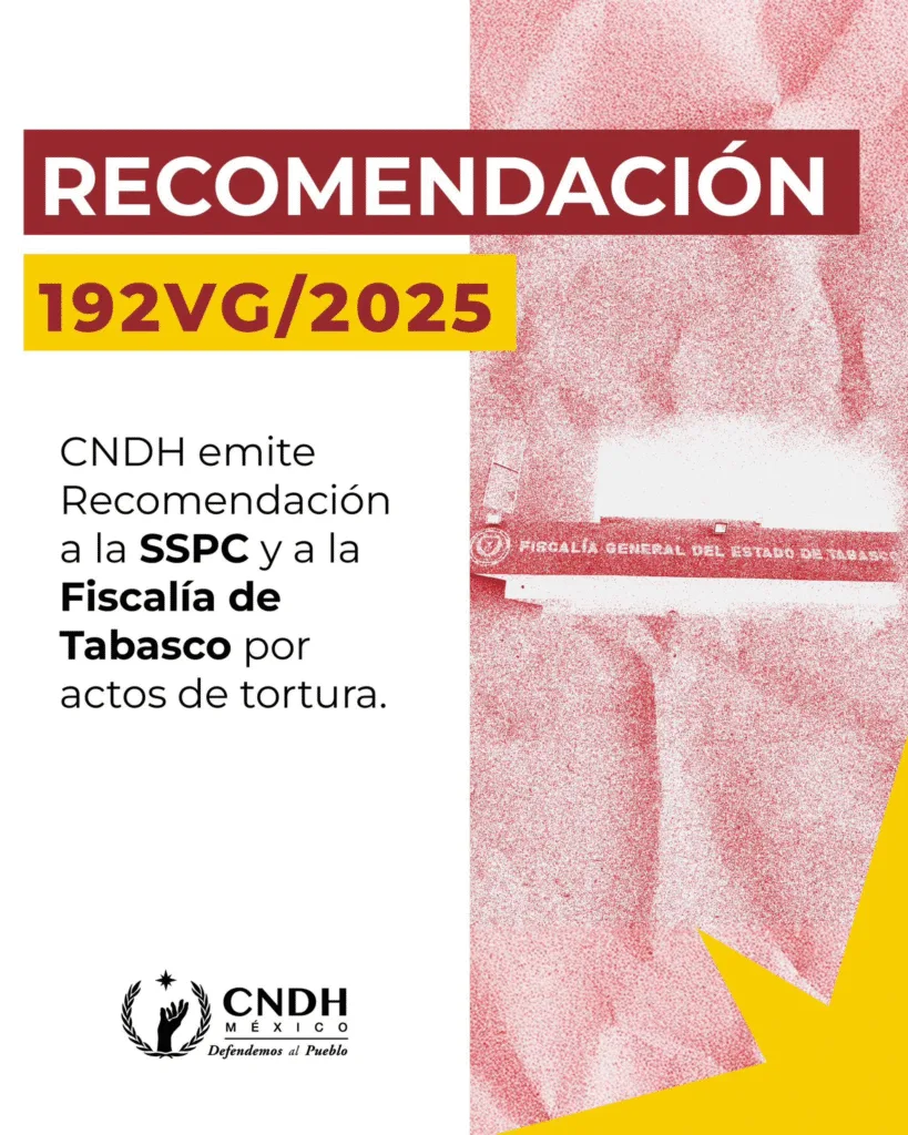 Dirigimos la #Recomendación 192VG/2025 a la @SSPCMexico y a la @FGETabasco por actos de tortura cometidos en 2015, que solocita se proporcione atención psicológica y la reparación integral del daño a las víctimas.