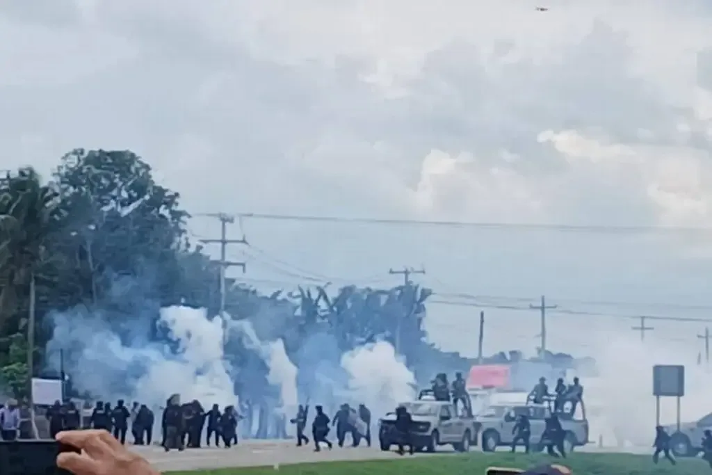 Elementos de la policía antimotines realizaron un operativo para despejar a manifestantes en la carretera Cárdenas hacia Coatzacoalcos.