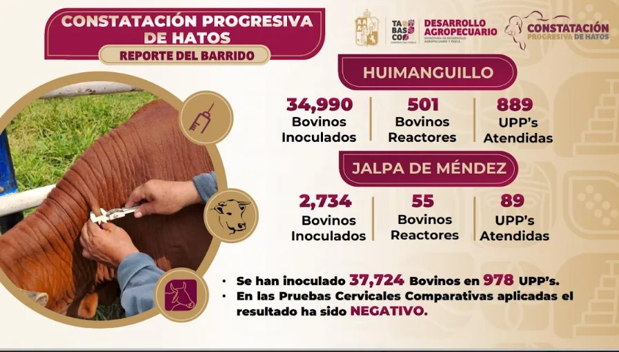 En el tema del barrido sanitario, el servidor público destacó que ya se han inoculado 34 mil 990 bovinos en Huimanguillo y 2 mil 734 en Jalpa de Méndez, y anunció que todas las pruebas cervicales comparativas han resultado negativas a tuberculosis.