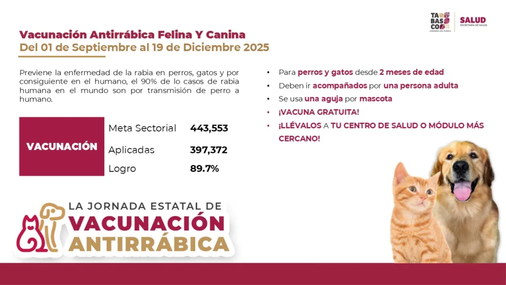 De igual manera indicó que se avanza en la vacunación contra el Sarampión, con la aplicación de 84 mil 180 dosis, lo que representa un avance del 89%. A nivel nacional, Tabasco ha logrado mantenerse con sólo dos casos confirmados de dicha enfermedad.