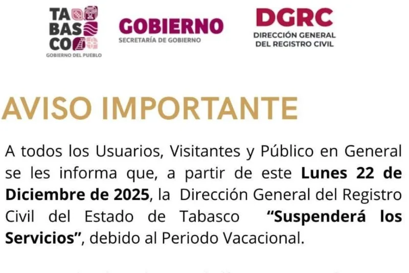 Tabasco.- La Dirección General del Registro Civil de Tabasco anunció la suspensión temporal de sus actividades a partir del lunes 22 de diciembre de 2025, con motivo del periodo vacacional de fin de año.