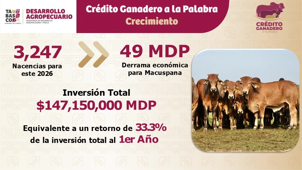 Asimismo, se destacó que en el municipio de Macuspana se realizó una inversión de más de 147 millones de pesos, con la entrega de miles de cabezas de ganado. De acuerdo con los datos presentados, se prevé la generación de nacencias durante el año, lo que permitirá ampliar el número de beneficiarios del programa.