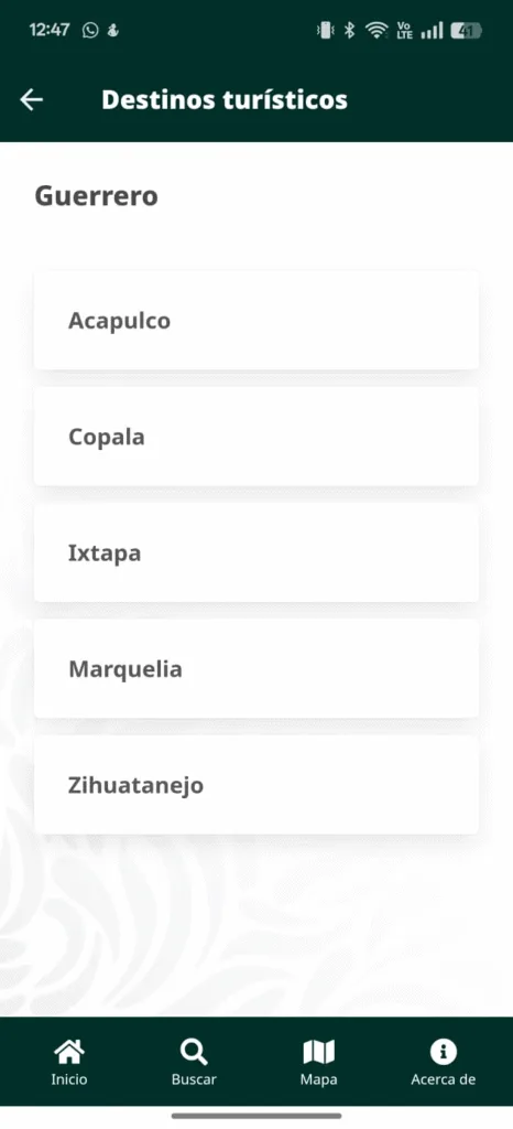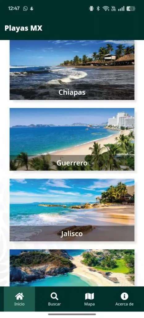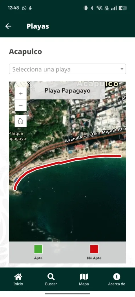 Playas MX ya está disponible para dispositivos Android e iOS. Al abrir la aplicación, el usuario puede seleccionar el estado costero, buscar una playa específica o explorar el mapa interactivo para identificar zonas seguras. Una línea verde indica que la playa es apta, mientras que una roja señala que es no apta por exceso de contaminantes.