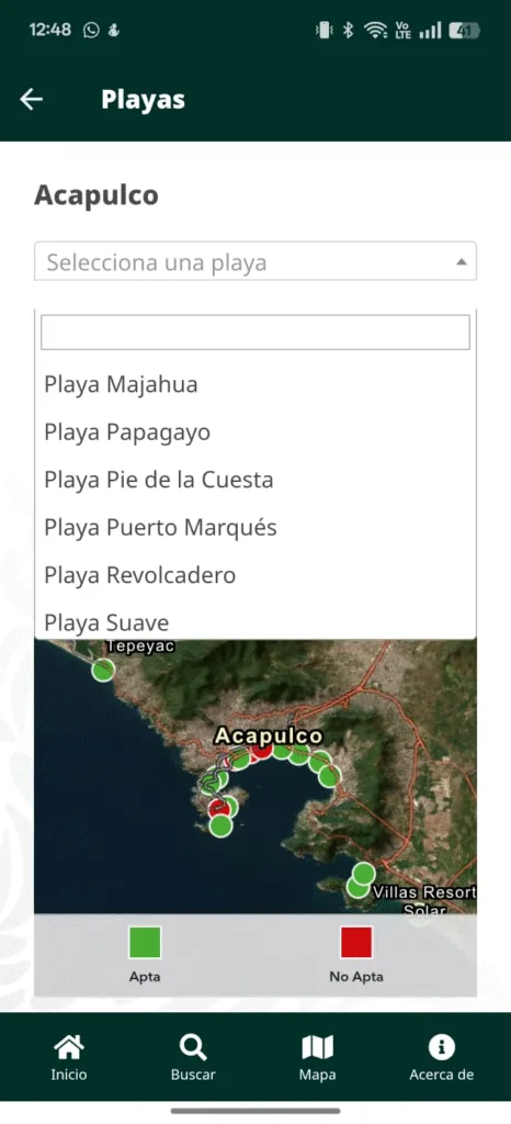 La app incluye información proveniente de 393 puntos de muestreo en 17 estados costeros y utiliza parámetros establecidos por la Organización Mundial de la Salud (OMS), como el límite de 200 enterococos fecales por cada 100 mililitros de agua.