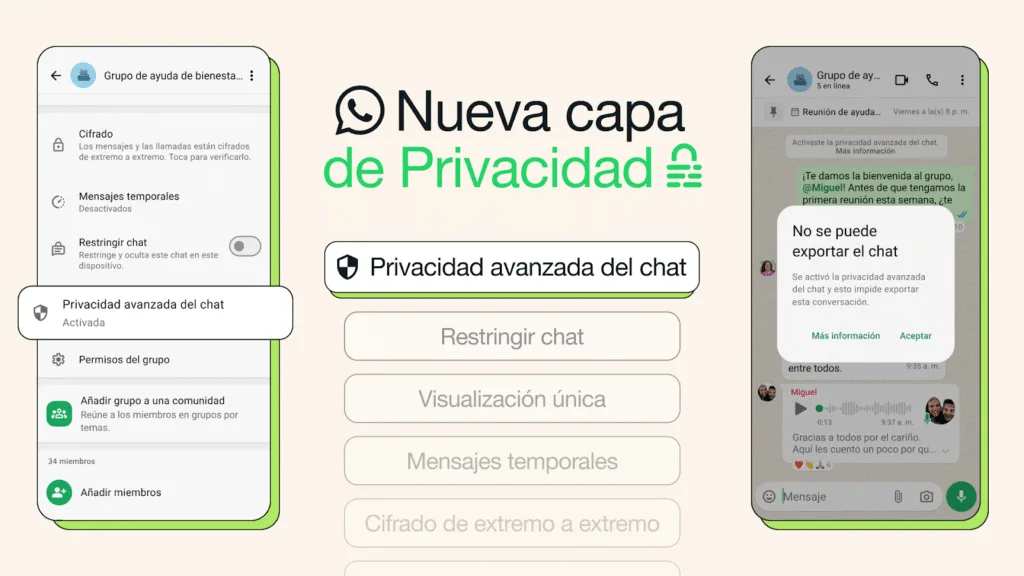 La Privacidad Avanzada se activa para prevenir la exportación de chats, la descarga automática de contenido o el uso de mensajes para funciones de inteligencia artificial.