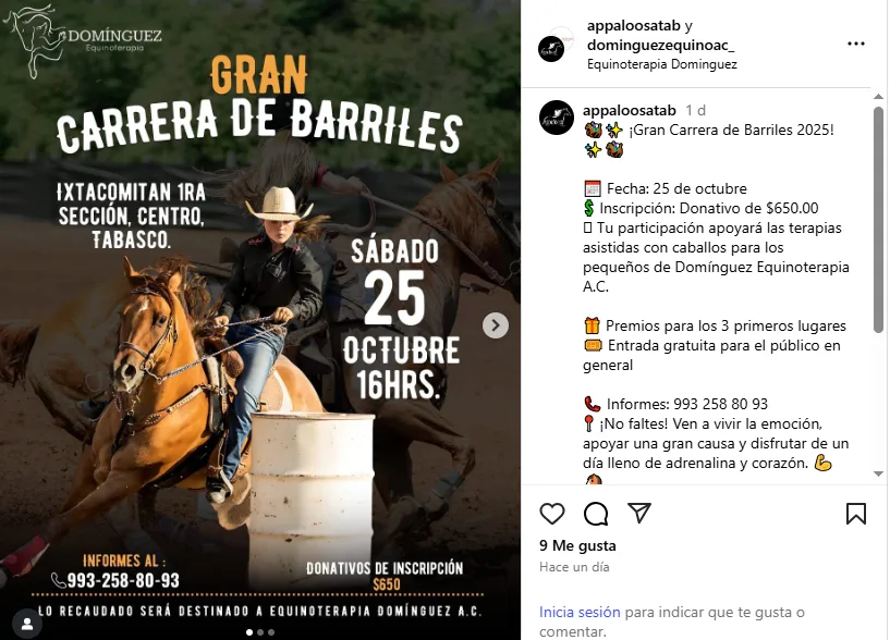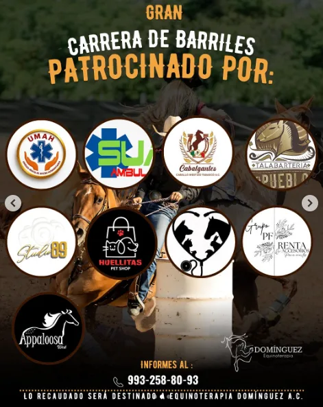 Tabasco –El próximo sábado 25 de octubre se celebrará la “Gran Carrera de Barriles”, un evento deportivo y altruista que tiene como objetivo recaudar fondos para becar a niños que reciben terapias en el Centro de Equinoterapia Domínguez A.C. La cita es en Ixtacomitán primera sección a partir de las cuatro de la tarde.