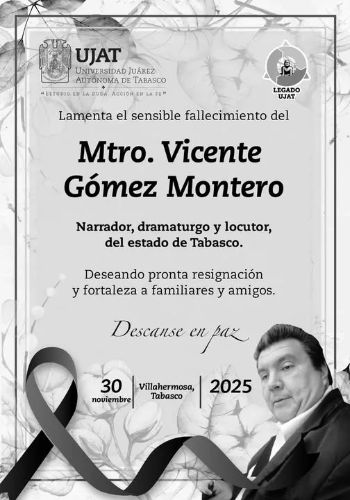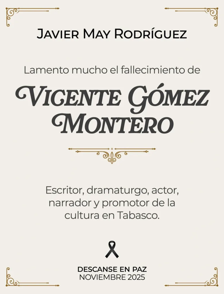 Villahermosa, Tabasco.- La escena cultural de Tabasco está de luto ante la pérdida de el prolífico artista multidisciplinario Vicente Gómez Montero, este sábado en Villahermosa. Su extensa trayectoria deja un legado en la literatura, el teatro, la gestión cultural y la formación de nuevos talentos.